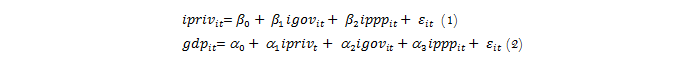 Table 2 provides the results for the panel unit root tests proposed by Im et al. (2003 ) for the sample of ASEAN, non-ASEAN countries and all countries in the sample. The results consistently suggest that all of the series are nonstationary in their levels, namely ipriv, igov, ippp, gdp. The same tests reject the null hypothesis of unit root process at 1 percent for the above variables when they are transformed to their first difference. Therefore, we conclude that ipriv, igov, ippp and gdp follow I(1) process.