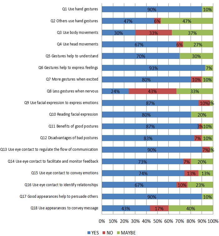 Next, based on the Figure 3, the second highest percentage of ‘Yes’ came from the respondents ‘Q1 – Used hand gestures’, ‘Q13 – Use eye contact to regulate the flow of communication’, and ‘Q17 – Good appearance can help to persuade others’ had the total of 90%. This shows that the respondents used these nonverbal cues quite frequently. They used hand gestures to communicate with each other like waving goodbye or giving thumbs up to show approval. They may also use eye contact to regulate flow of communication like looking the other to signal pause of the conversation or opening the eye wide to increase the intensity of the conversation. Appearance can be used to persuade other is like a daily habit. Nonverbal cues an also be applied in oral presentation in order to improve the way the presenters present their topic. This can be done by using hand gestures to attract the attention of the audience, using eye to regulate the flow of the presentation and by adding of having a good appearance during the presentation. These can further improve not only the confidence of the presenter but also the confidence of the audience witnessing the presentation. These findings are in accordance with the study by Yoon et al. (2016) wo found that maintaining eye contact can help regulate the flow of the conversation with others and also with a proper appearance can help persuade others better.