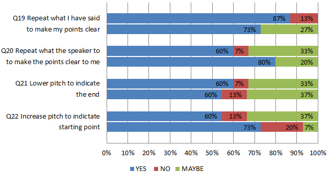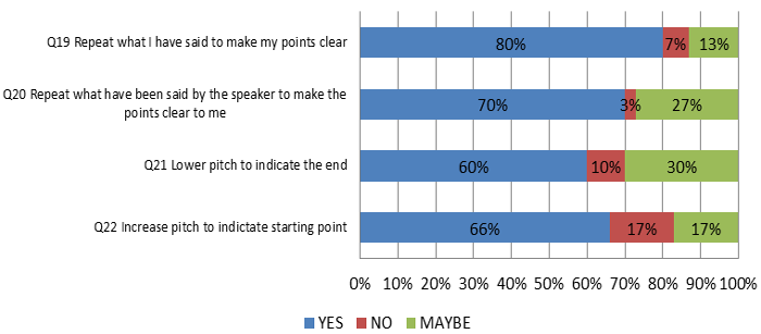 Figure 4 showed the highest percentage of ‘Yes’ came from the question Q19 – Repeat what I have said to make my point clear with a total of 80%. This shows that the respondents knew that by doing repetition, they can make their point much clearer so that the listener can fully understand the message. Repeating the same point can help to reinforce the understanding of the topic not only to the speaker but also to the listener. This is same as learning something new. By repeating the same thing over and over again, the new knowledge will eventually be much more understandable at some point. This finding is in accordance with the study by Lunenburg (2010) who stated that by repeating the same point the point made will make the message clearer.