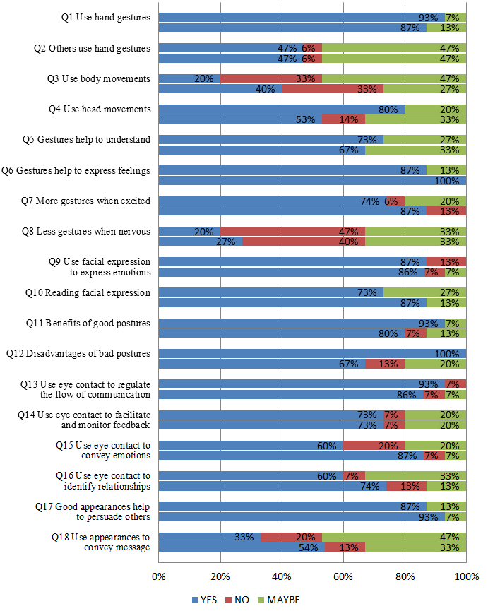 However there is another lowest number of ‘Yes’ for female which came from question ‘Q3 – Use body movement’ with a total of 20% while the male has 20% more. The result is caused by how the female gender felt that using their body to communicate seemed a bit inappropriate. It is important to know how to communicate using body movements because it is a skill that can help presenters in any situation even in an oral presentation, simple nodding ‘Yes’ to the correct answer could save time.