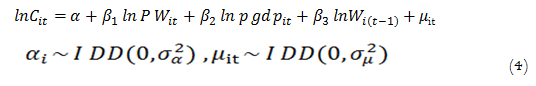 Among them, αi is independent of μit, for all i and t, Wi(t-1), PWit, and pgdpit. These three independent variables are also independent of αi and μit; αi is a random variable of individual influence, and E(αi)=0,Var(αi)=бa2ee’,e=(1,2,3,4,)’ is T-dimensional column vector, μit is a random error term, satisfying
