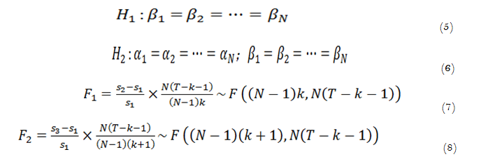 Then we test whether there are individual and structural effects in sample panel data. We mainly test the following original hypothesis H1 and alternative hypothesis H2 by constructing F1 and F2 statistics. Among them, F1 corresponds to the original hypothesis H1 and F2 corresponds to the alternative hypothesis H2. The specific form is as follows (formula 5-8):