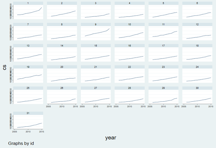 Figure 2 shows that the trend of per capita consumption expenditure in all provinces (municipalities) is basically the same, but the intercepts are different. There is no structural difference in per capita consumption expenditure, but there is individual heterogeneity in variables, which is consistent with the conclusions of F1 and F2 statistics.