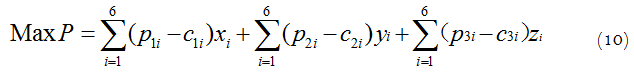 Given that group’s profit value is P, p1i is coking coal price of the ith mine,c1i is coking coal production cost of the ith mine; p2i is power coal price the of the ith mine, c2i is power coal production cost of the ith mine, p3i is steaming coal price the of the ith mine, c3i is steaming coal production cost of the ith mine. The xi is coking coal productionfrom the ith mine, yi is power coal output from the ith coal mine, zi the steaming coal production from the ith mine. Then