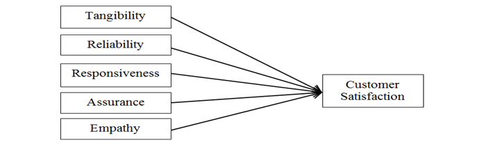 ). By referring to the SERVQUAL model (refer to Figure 1), customer satisfaction is determined by tangibility, reliability, responsiveness, assurance, and empathy which are the service quality dimensions. The SERVQUAL is one of the most commonly used in measuring the relationship between service quality and satisfaction (Martin, 2007