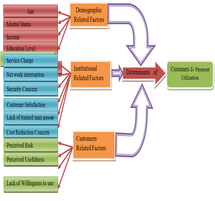 As it has been reviewed from previous empirical studies in the above sections, factors that determines E-payment utilization in the study area were divided into demographic related factors, Institutional related factors and Customers’ related factorsthat hinder their E-payment adoption behavior. Thus, this study has constructed the following conceptual framework based on the reviewed empirical findings as follows.