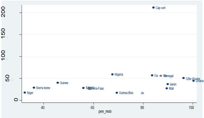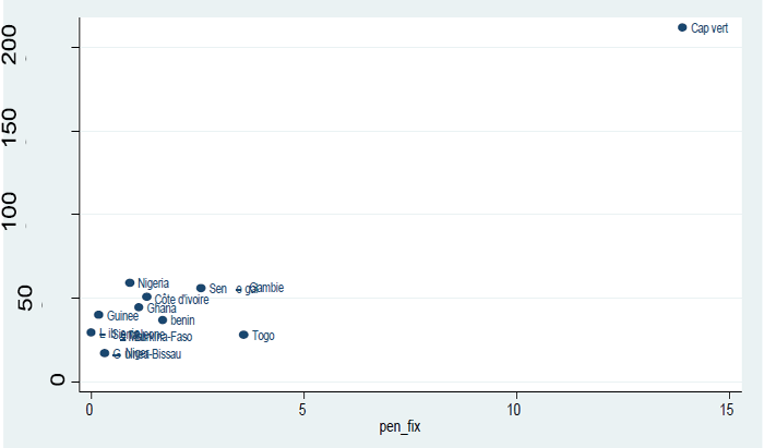 With regard to fixed telephone use, Figure 2 shows for ECOWAS countries, the fixed telephone penetration rate in relation to the level of per capita income. The analysis shows that Cape Verde has the highest penetration rate, unlike Niger and Guinea Bissau and all the other countries in the Community area, which have a relatively low rate. In relation to national income per capita, one can also suspect a positive correlation. Taking the example of Cape Verde, which has a significantly high per capita national income compared to other ECOWAS countries, it is the only country with the highest number of fixed telephone users per 100 inhabitants.