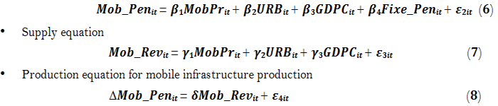 However, studies on the analysis of this relationship in developing countries, particularly ECOWAS countries, are almost limited. The goal of this research is to highlight the effects of telecommunications infrastructure on economic growth in ECOWAS countries. In terms of value-added, the analysis in this article focuses on the effects of telecommunications infrastructure in terms of demand, supply and effects on per capita income. However, it should be noted that issues of telecommunications market structure are not addressed but that the lack of information on the level of investments made leads to the use of a proxy measure in terms of supply and demand for these telecommunications services. From the point of view of empirical strategy, the triple least square (3SLS) technique is used. This technique provides coefficients for all structural equations and endogeneity bias. The results show that the increase in telecommunications infrastructure raises operators' revenues and therefore their earnings. Thus, the results show the positive impact of the expansion of both mobile and fixed telephone infrastructure on per capita income.
