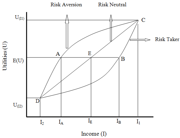 ) states that the attitudes of farmers in facing production risks are grouped into three, namely: risk aversion, risk neutral, and risk taker. The three attitudes of farmers in facing production risks related to utility and income can be seen in Figure 1.
