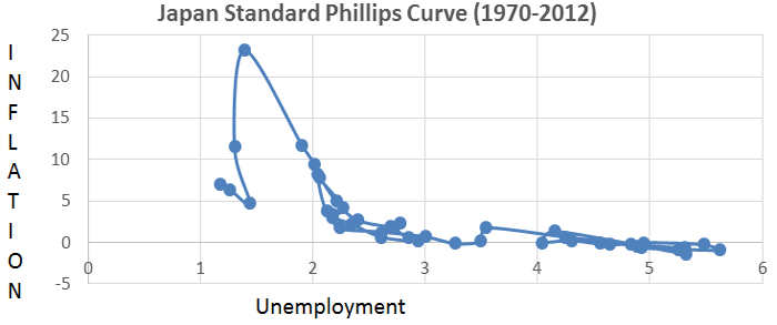 ) found transactions changes the slope, needing more people. A changing Phillips Curve slope or shift, and their underlying reasons, may affect volatility. Randomly chosen Phillips Curves for the United States and Japan are shown in Figures 3-4 (with data from the U.S. Dept. of Labor, “International Comparisons,” “International Indexes” 2017). The United States has the most reliable curvature shape, likely from better central bank and fiscal policy. Japan’s “linear” graph reflects better expectations.