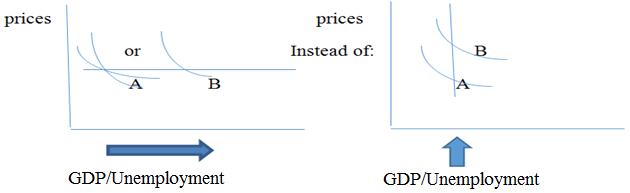 The simplest way to observe how changes in the economy affect employment and inflation in the Phillips Curve model is that some variable causes supply to change in the economy, the short-run demand curve shifts either to the right or left. Shifts to the right increase employment and GDP temporarily, but raise prices. Shifts to the left reduce employment and GDP temporarily, but lower prices. Despite temporary changes, firms, faced with more or fewer employees, will raise or lower wages, causing the short-term supply curve to shift back to its long-term level (Arnold, 1998) . In effect, most economists prefer that wages fall in recessions so firms have more money, shifting the supply curve outwards to reach full employment, as it did, for instance, in the U.K’s 2014 recovery (Pettinger, 2014