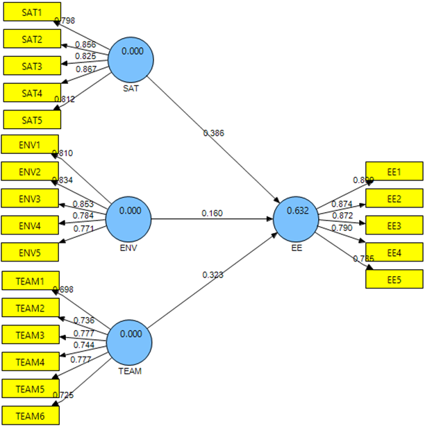 In Table 4 hypothesis 1 predicts a positive relationship between work environment and employee engagement and the result shows that there is a positive and significant influence of work environment on employee engagement (ß = 0.160, t = 3.562); as a result, H1 is supported. The result of hypotheses 2 also shows a significant and positive relationship between employees’ satisfaction and employee engagement (ß = 0.386, t = 7.458); thus supporting H2. Lastly, hypotheses 3 result also shows that there is a positive and significant relationship present between team work and employee engagement (ß = 0.323, t = 7.336); therefore, H3 is supported. This study also evaluated the R2 of the endogenous construct of employee engagement. The R2 shows moderate values Figure 1 which signify results meaningfulness for explanation.