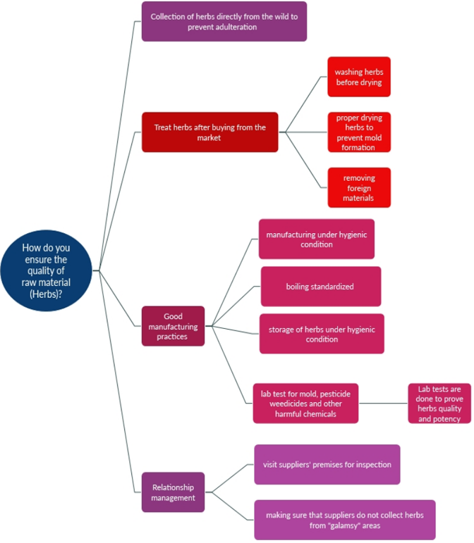 The diagram below provides the pictorial view of responses under the four themes, 1) collection of herbs directly from the wild; 2) treatment of herbs from suppliers before usage; 3) good manufacturing practice; 4) relationship management.