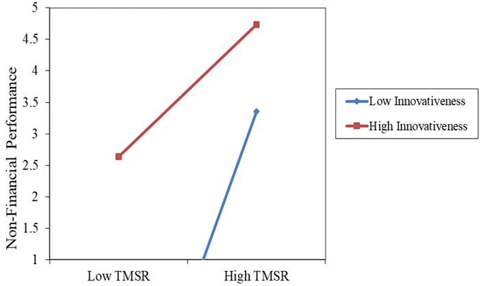 These moderation results are further illustrated by Figure 1, which indicates that at low levels of TMT Shared Responsibility, non- financial performance is high with high levels of Innovativeness and vice-versa. This interaction indicates that performance increases with both increase in TMT shared responsibility and innovativeness, the opposite also applies. Hence, Innovativeness acts as a remedy for low TMT Shared Responsibility in enhancing non- financial hotel performance.