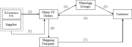 Another case is a start-up named China-TZ Orders, founded by an international student in 2019. Although online shopping is very infrequent in his country, the founder saw an opportunity and started his business on WhatsApp, advertising items found on Alibaba, Taobao, and other platforms to people in his country who might be interested in them. The items were of good quality and quite affordable. Most African countries do not have online platforms or cross-border applications where people can order items from supplying countries such as China. However, African customers use Instagram, Twitter, WhatsApp, and Facebook. The founder employed WhatsApp Groups for marketing. Figure 3 demonstrates the business model of the China-TZ Orders start-up.