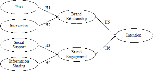 According to the definition of brand relationship, only when consumers have been pleasant during they encounter with the brand previously, they will be anticipated to be a high-quality consumer-seller connection during their future interactions with the brand (Jaiswal, Niraj, Park, & Agarwal, 2018). A healthy relationship can only be established when buyers are satisfied with their purchase and have faith in the brand’s ability to fulfil their obligations. To better understand the importance of brand relationships in social media, Liang et al. (2011) used a relationship marketing lens to examine the brand relationships of online consumers. They discovered that good consumer-brand relationships had a favourable impact on consumer purchase intention. In a similar vein, Pentina, Gammoh, Zhang, and Mallin (2013) revealed the positive effects of brand relationships on consumers’ intention to continue advocating for a brand on social media. In forums and communities, people are eager to engage and contribute by sharing their own experiences and information and offering advice and recommendations to other members. The trust, satisfaction, and dedication they perceive in the community will be strong (Hajli, 2014). Brand-related marketing theories have demonstrated the impact of brand relationships in the social media context (Carlson, Wyllie, Rahman, & Voola, 2019; Hudson, Huang, Roth, & Madden, 2016). These findings have shown that brand relationships have an impact on the likelihood of consumers recommending brands to others and that they intend to continue using SNSs and brands in the future (Swani & Labrecque, 2020). Alternatively, it may be said that any successful business strategy built on social commerce should consider how best to improve the quality of relationships with online consumers, so that they are encouraged to participate in community branding, which supports the following hypothesis: